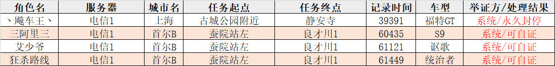 2017年8月起稽查将交由系统玩家实名举报试行俩部分分别出击,请上图中大神们于指定时间之前回贴出示视频演示,指定车型,指定城市(赛道),起点至终点间的路线记录,录制成为视频发布至视频网站,腾讯等,将视频链接以回贴的形式进行自证成功自证(视频中呈现正常走线,成绩与产生成绩无限接近判定为成功)可免于进入黑名单的处罚并获得1000万CT/路线奖励; 若未能自证成功,或不自证将下次版本更新时清空此角色所有路线记录,并将通行证加入黑名单