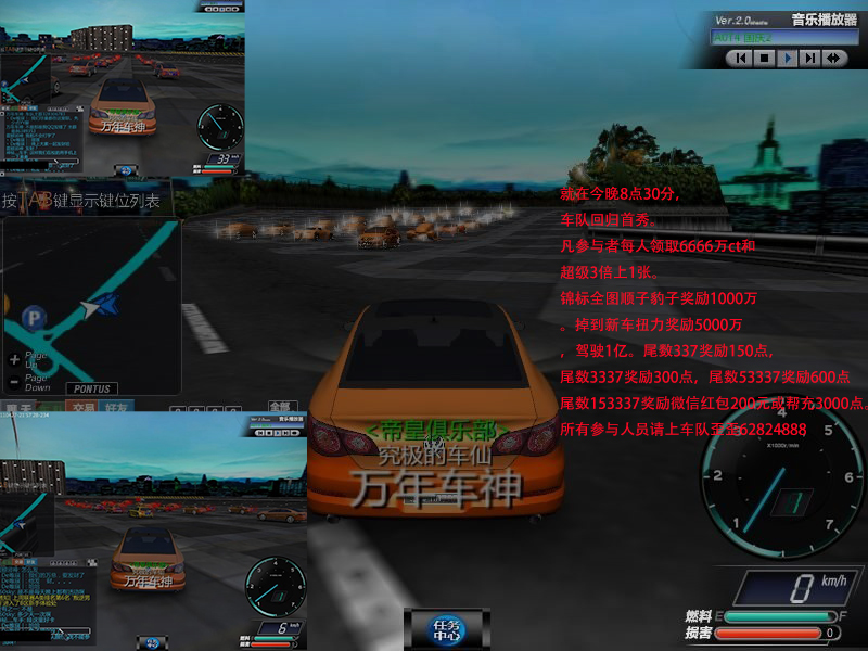 就在今晚8点30分,车队回归首秀。凡参与者每人领取6666万ct和超级3倍上1张。锦标全图顺子豹子奖励1000万。掉到新车扭力奖励5000万,驾驶1亿。尾数337奖励150点,尾数3337奖励300点,尾数53337奖励600点,尾数153337奖励微信红包200元或帮充3000点。所有参与人员请上车队歪歪62824888