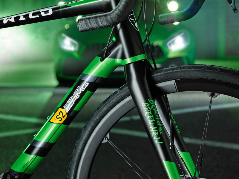 R.S2“绿色地狱的野兽”限量版是一辆轻量化的碟刹公路车,它的名字来源于AMG GT-R,并且使用了同款的绿色涂装。这辆R.S2是Rotwild和Mercedes-AMG合作推出的第三辆车,用来庆祝AMG成立50周年。虽然Rotwild是山地车品牌,但他们的R.S2自2014年以来一直使用碟刹,在后续版本中也进行了一些小改进。