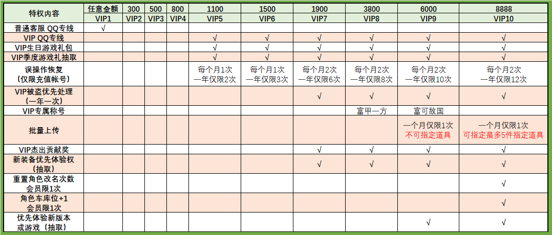 4.VIP10和VIP9一样如果改资料直接降成VIP8,需要充值达到对应金额5088元才能恢复VIP10(VIP8恢复到VIP10,新增特权中的改名次数重置、车库数量+1,不再额外增加);