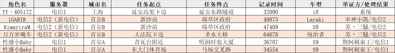 2017年8月起稽查将交由系统玩家实名举报试行俩部分分别出击,请上图中大神们于指定时间之前回贴出示视频演示,指定车型,指定城市(赛道),起点至终点间的路线记录,录制成为视频发布至视频网站,腾讯等,将视频链接以回贴的形式进行自证成功自证(视频中呈现正常走线,成绩与产生成绩无限接近判定为成功)可免于进入黑名单的处罚并获得1000万CT/路线奖励; 若未能自证成功,或不自证将下次版本更新时清空此角色所有路线记录,并将通行证加入黑名单