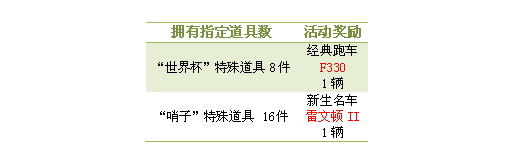 活动内容:活动期间,官方每天都将为每一位前1天有过《飚车世界》任意服务器登录记录的玩家通行证帐号打入1套“世界杯”球员特殊道具(4件)及1张“球队征召令”图纸;