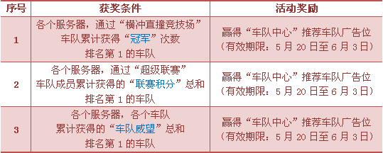 活动期间,假如多支车队获得的“横冲直撞竞技场”冠军次数相同,则取车队威望最高的那支车队为获奖车队;车队威望数据截至活动数据统计时;